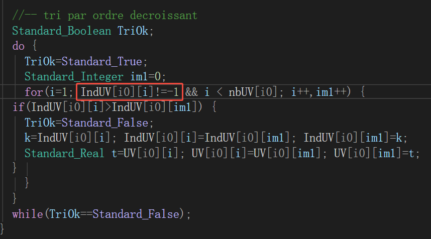 kk k Thu, 01/29/2026 - 14:13 Forums: Modeling Data and AlgorithmsOccasionally, a segmentation fault occurs when executing the HLRBRep_Algo::Hide() method. Could you please tell me what might be causing this issue Attachments: 企业微信截图_1769685058958.png Dmitrii Pasukhin Fri, 01/30/2026 - 11:08 Hello. Please share the code and file to reproduce. Also please share the OCCT version which you are using. Best regards, Dmitrii. Log in to post comments kk k Sat, 01/31/2026 - 12:56 Occasionally, this issue occurs when the call frequency is high. Could it be a memory allocation problem? The version is 7.8.0 Attachments: Compound.brep Log in to post comments Dmitrii Pasukhin Sat, 01/31/2026 - 13:22 Please also share the code. The frequency means you call it in multithread? Best regards, Dmitrii. Log in to post comments kk k Fri, 03/13/2026 - 10:35 Hello, the issue has been resolved. The array out-of-bounds exception occurred at the position marked with a red box in the attachment Attachments: 企业微信截图_17733872277408.png Log in to post comments gkv311 n Sat, 03/14/2026 - 14:15 Do you mean you have swapped conditions to check the range before accessing array value and this solved issue with random crashes, or just localized the crash place? Standard_Integer im1=0; - for(i=1; IndUV[i0][i]!=-1 && i<nbUV[i0]; i++,im1++) { + for(i=1; i<nbUV[i0] && IndUV[i0][i]!=-1; i++,im1++) { Log in to post comments kk k Mon, 03/16/2026 - 04:18 Check the array range before accessing array values, which is the green line in the image Log in to post comments kk k Sat, 01/31/2026 - 14:23 No multithreading is used. TopoDS_Shape topoShape; BRepTools::Read(topoShape, "filename", BRep_Builder()); for (int i = 0; i < 500; i++) { HLRAlgo_Projector algoProjector(gp_Ax2(gp_Pnt(0, 0, 0), gp_Dir(0, 0, 1))); Handle(HLRBRep_Algo) pHLRAlgo = new HLRBRep_Algo; pHLRAlgo->Add(topoShape); pHLRAlgo->Projector(algoProjector); pHLRAlgo->Update(); pHLRAlgo->Hide(); } Log in to post comments
