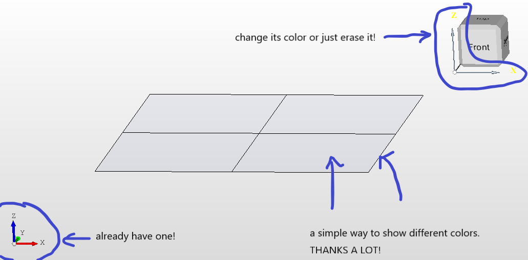 Hello, 1. to change the color of the coordinate system near the viewcube :: ( I put red , green , blue ; you may choose the color you want )