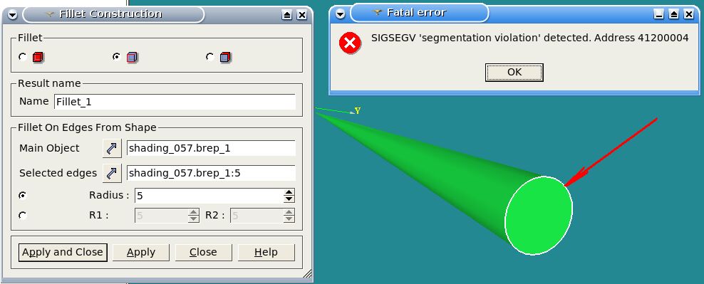 | Description | GUI6.3 Error message SIGSEGV is shown after attempt creating fillet on the attached shape 1)Start SALOME application=>Activate new study and GEOM module 2)”File”=>”Import”=>Select and load file “shading_057.brep” 3)”Operation”=>”Transformation”=>”Fillet” 4)Select as Main object “shading_057.brep_1”=>Activate second radio button 5)Press arrow near control “Select edges” => Select in 3D Viewer edge “shading_057.brep_1_1:5” Problem: error message “SIGSEGV…” is shown Note: bug is reproducted on OC v6.3 ONLY!!! | ||||
