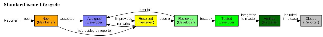 Attached are two other variants of the graph: issue-life-cycle-szv.png proposed by Sergey (szv), and issue-life-cycle2.png made with dot basing on Sergey's idea and with colors synchronized with actual Mantis ones |
