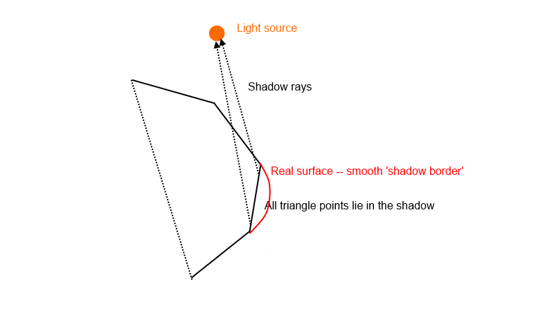 Bug with sphere shadows ("rt-shadows.png") is not actually the bug -- it is result of rought geometry. To compute shadows, normals are not used at all. The only way to remove these artifacts is to improve tesselation accurancy. See "sphere_test.png" for example (for the right sphere tessellation is slightly better). The reason for the sharp shadow edges on rought triangulations is shown in "rt_shadows.png". |