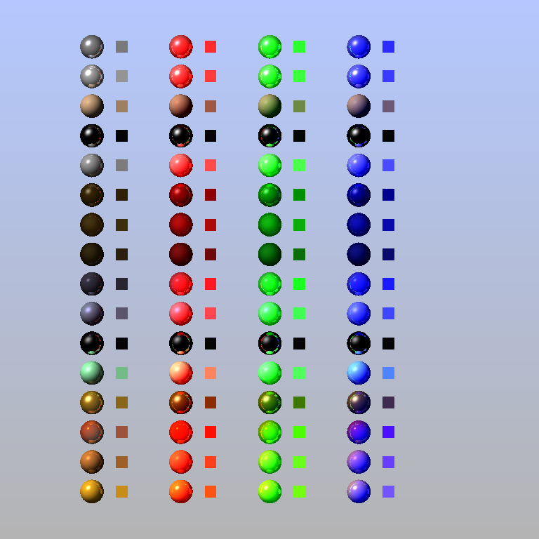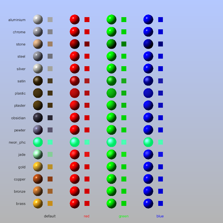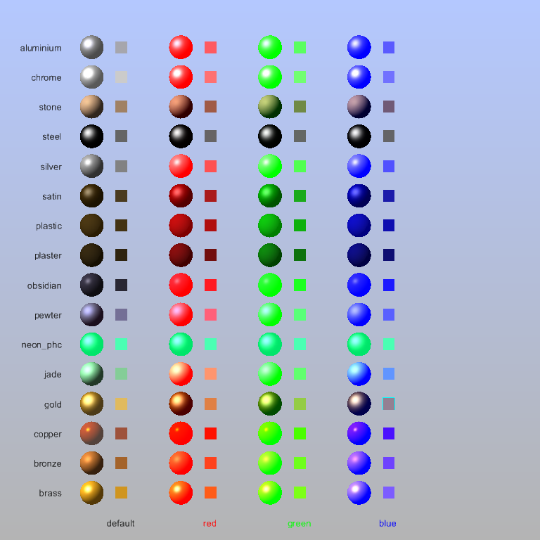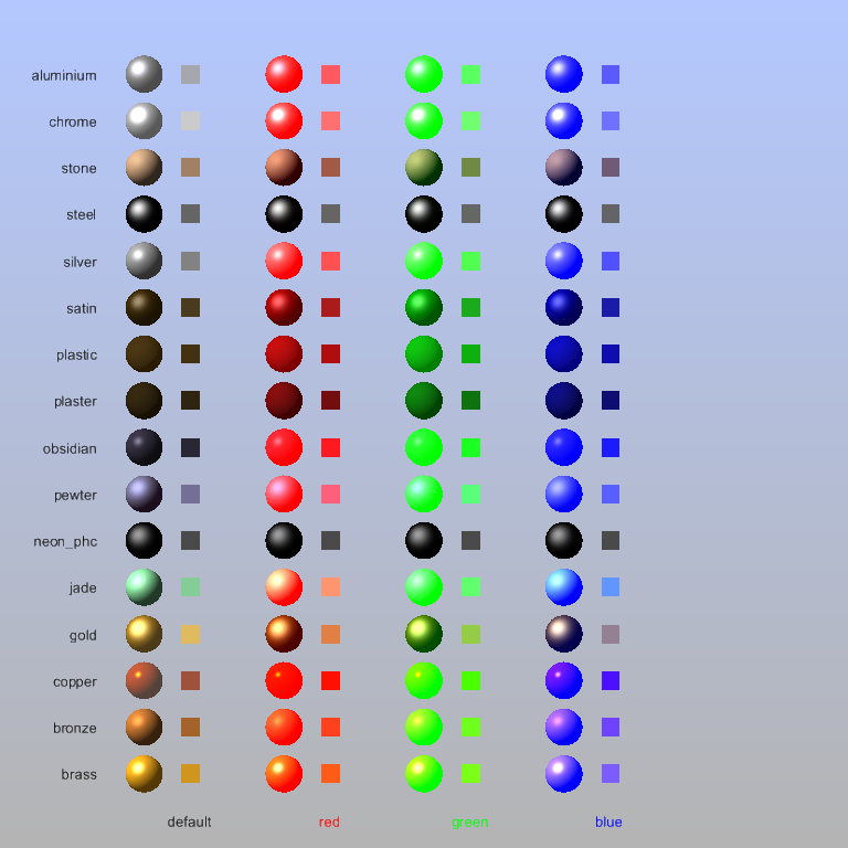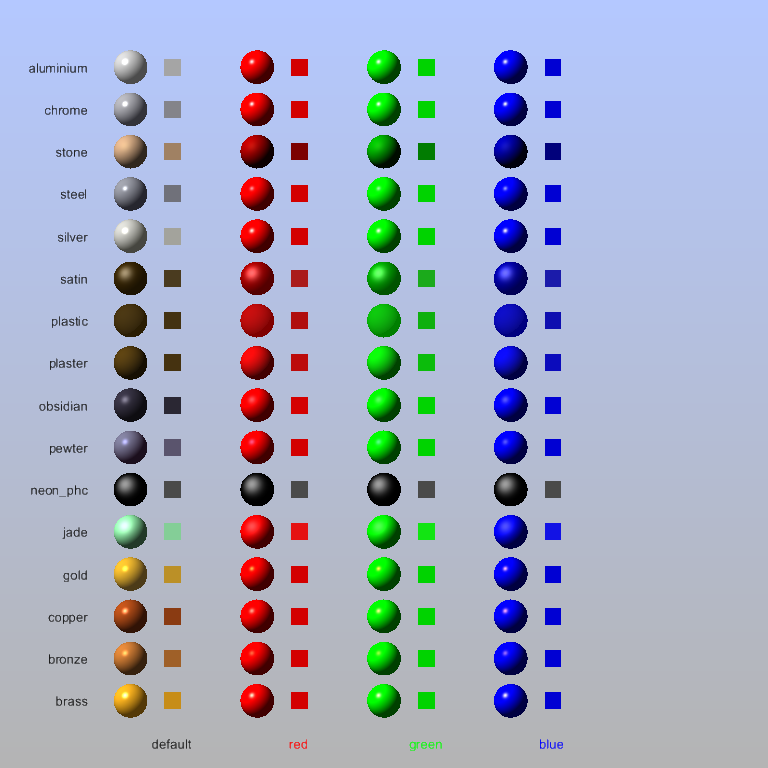 I deem it is worth adding a sample, say samples/tcl/materials.tcl, displaying a set of objects (e.g. box + sphere) with different materials assigned. Perhaps also setting different colors can be demonstrated. |