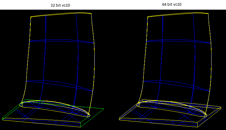 It's seems that there is a some problem with face-face intersector (inside BOPAlgo). I extracted two faces from initial shape - f1.brep + f2.brep. The following script can be used to reproduce this issue: restore f1.brep restore f2.brep bopcurve f1 f2 That script produce the following results: 32bit: Tolerance Reached=0.05492097931250408 2 curve(s) found. c_1 c_2 (out32.jpg) 64bit: Tolerance Reached=9.0623070963573101e-005 2 curve(s) found. c_1 c_2 (out64.jpg) |