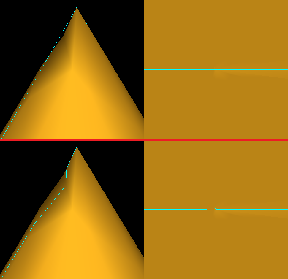 I don't see the issue in this particular case - the behavior of on-triangulation isoline builder is correct. The not nice-looking triangles on cone is the problem of mesh builder, not isolines builder. |