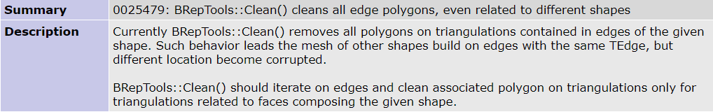 | Summary | 0028026: Modeling Data - BRepTools::Clean() does not clean all triangulation from shape | ||||