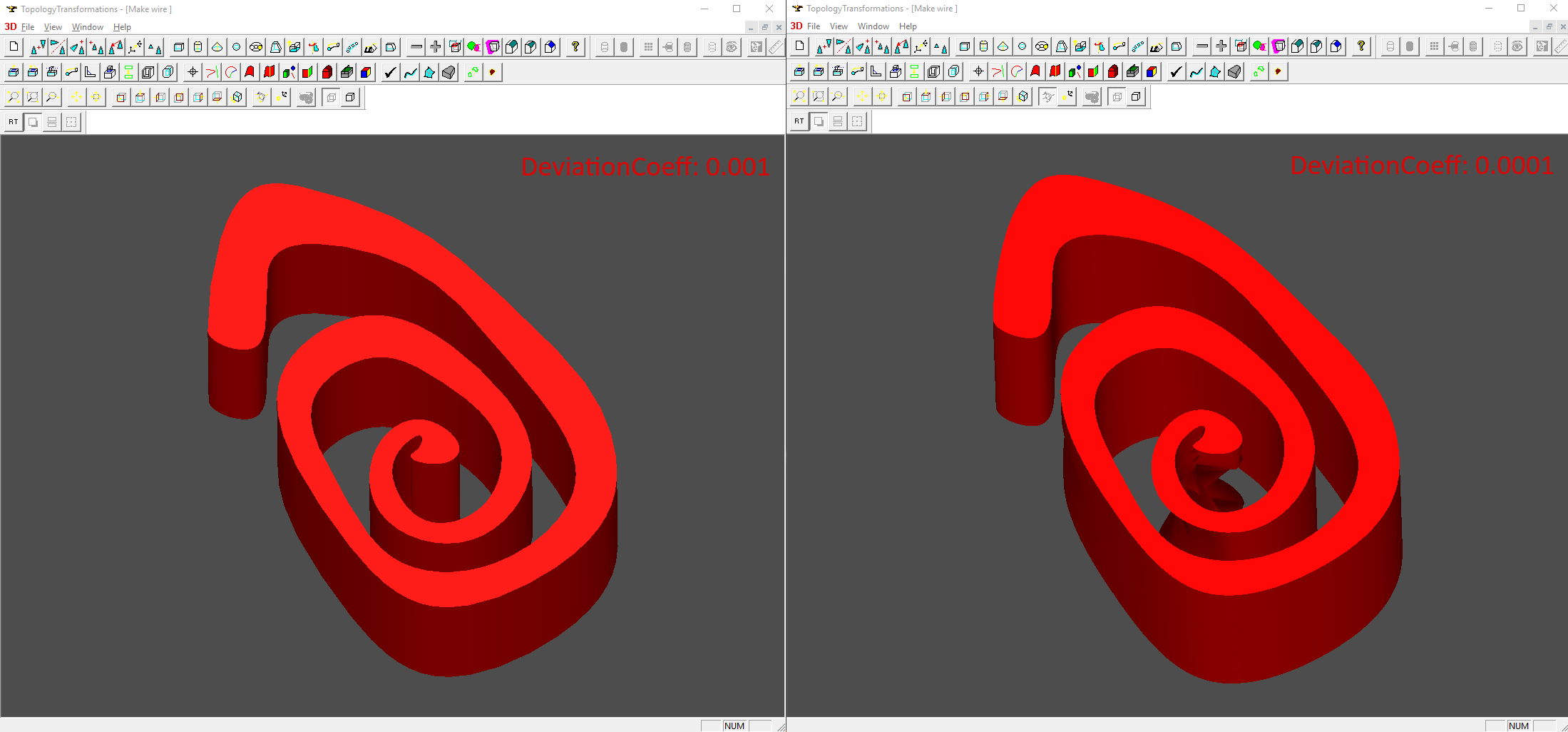 | Steps To Reproduce | Use MFC sample to reproduce this issue, paste code below in void CModelingDoc::OnWire() and use this callback to reproduce an issue. TColgp_Array1OfPnt poles(0, 41); poles(0) = gp_Pnt(-6.84864, -2.89698, 0); poles(1) = gp_Pnt(-7.8487, -1.93627, 0); poles(2) = gp_Pnt(-9.6224, 0.166697, 0); poles(3) = gp_Pnt(-11.6493, 4.15099, 0); poles(4) = gp_Pnt(-7.22539, 6.87438, 0); poles(5) = gp_Pnt(-2.78612, 8.73483, 0); poles(6) = gp_Pnt(3.2602, 8.5477, 0); poles(7) = gp_Pnt(8.61314, 8.72234, 0); poles(8) = gp_Pnt(13.3373, 5.45586, 0); poles(9) = gp_Pnt(13.0446, -0.0814708, 0); poles(10) = gp_Pnt(10.2305, -5.93577, 0); poles(11) = gp_Pnt(3.08747, -5.17017, 0); poles(12) = gp_Pnt(-4.45148, -3.10821, 0); poles(13) = gp_Pnt(-2.90664, 4.40597, 0); poles(14) = gp_Pnt(2.87423, 5.66723, 0); poles(15) = gp_Pnt(9.17142, 4.92753, 0); poles(16) = gp_Pnt(10.07, -1.58282, 0); poles(17) = gp_Pnt(4.86466, -4.12707, 0); poles(18) = gp_Pnt(2.02312, -0.942018, 0); poles(19) = gp_Pnt(2.75268, 2.11217, 0); poles(20) = gp_Pnt(5.74315, 2.28662, 0); poles(21) = gp_Pnt(5.57045, 0.539952, 0); poles(22) = gp_Pnt(3.72607, -0.548149, 0); poles(23) = gp_Pnt(4.13943, 0.555394, 0); poles(24) = gp_Pnt(3.58471, 1.3003, 0); poles(25) = gp_Pnt(3.19694, -0.607524, 0); poles(26) = gp_Pnt(4.44757, -1.87283, 0); poles(27) = gp_Pnt(7.15539, -2.24152, 0); poles(28) = gp_Pnt(8.78645, 0.63375, 0); poles(29) = gp_Pnt(6.81713, 4.25501, 0); poles(30) = gp_Pnt(2.76623, 3.72653, 0); poles(31) = gp_Pnt(-0.987364, 2.77836, 0); poles(32) = gp_Pnt(-2.22717, -2.14245, 0); poles(33) = gp_Pnt(2.77299, -3.55277, 0); poles(34) = gp_Pnt(7.1953, -4.97274, 0); poles(35) = gp_Pnt(11.3418, -1.3008, 0); poles(36) = gp_Pnt(11.8577, 5.93719, 0); poles(37) = gp_Pnt(4.74475, 6.4367, 0); poles(38) = gp_Pnt(-0.655365, 7.24096, 0); poles(39) = gp_Pnt(-4.91041, 5.87339, 0); poles(40) = gp_Pnt(-9.27314, 1.79587, 0); poles(41) = gp_Pnt(-3.03765, -1.20269, 0); TColStd_Array1OfReal knots(0, 41); knots(0) = 0; knots(1) = 3.06334; knots(2) = 7.6806; knots(3) = 10.5737; knots(4) = 16.7067; knots(5) = 22.5611; knots(6) = 28.3149; knots(7) = 32.6648; knots(8) = 37.8111; knots(9) = 43.6011; knots(10) = 49.6044; knots(11) = 57.7091; knots(12) = 62.1695; knots(13) = 67.9016; knots(14) = 73.8824; knots(15) = 78.489; knots(16) = 83.2874; knots(17) = 86.5523; knots(18) = 89.0208; knots(19) = 91.2073; knots(20) = 92.072; knots(21) = 93.7356; knots(22) = 94.3118; knots(23) = 94.82; knots(24) = 95.6982; knots(25) = 97.8775; knots(26) = 100.039; knots(27) = 102.785; knots(28) = 105.81; knots(29) = 110.37; knots(30) = 113.465; knots(31) = 117.047; knots(32) = 121.723; knots(33) = 126.226; knots(34) = 130.541; knots(35) = 136.51; knots(36) = 142.871; knots(37) = 147.932; knots(38) = 153.249; knots(39) = 156.78; knots(40) = 161.284; knots(41) = 163.479; TColStd_Array1OfInteger mults(0, 41); mults(0) = 2; mults(1) = 1; mults(2) = 1; mults(3) = 1; mults(4) = 1; mults(5) = 1; mults(6) = 1; mults(7) = 1; mults(8) = 1; mults(9) = 1; mults(10) = 1; mults(11) = 1; mults(12) = 1; mults(13) = 1; mults(14) = 1; mults(15) = 1; mults(16) = 1; mults(17) = 1; mults(18) = 1; mults(19) = 1; mults(20) = 1; mults(21) = 1; mults(22) = 1; mults(23) = 1; mults(24) = 1; mults(25) = 1; mults(26) = 1; mults(27) = 1; mults(28) = 1; mults(29) = 1; mults(30) = 1; mults(31) = 1; mults(32) = 1; mults(33) = 1; mults(34) = 1; mults(35) = 1; mults(36) = 1; mults(37) = 1; mults(38) = 1; mults(39) = 1; mults(40) = 1; mults(41) = 2; int degree = 3; bool periodic = 1; Handle(Geom_BSplineCurve) spl = new Geom_BSplineCurve(poles, knots, mults, degree, periodic); BRepBuilderAPI_MakeEdge edge_maker(spl); BRepBuilderAPI_MakeWire wire_maker; wire_maker.Add(edge_maker.Edge()); BRepBuilderAPI_MakeFace face_maker(wire_maker.Wire()); BRepPrimAPI_MakePrism prism(face_maker.Face(), gp_Vec(0,0,15)); Handle(AIS_Shape) ais_prism = new AIS_Shape(prism.Shape()); ais_prism->SetOwnDeviationCoefficient(0.0001); myAISContext->SetColor(ais_prism,Quantity_NOC_RED,Standard_False); myAISContext->Display(ais_prism,Standard_False); ################ DRAW ##################### restore 29641.brep a tclean a vinit vdefaults -devCoeff 0.0001 vsetdispmode 1 vdisplay a vfit | ||||
