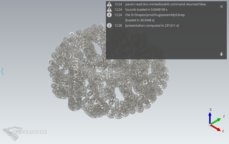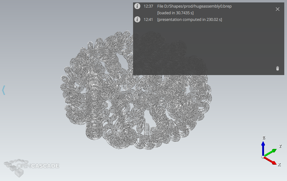 | Steps To Reproduce | pload MODELING restore [locate_data_file hugeassembly0.brep] a nbshapes a dchrono s restart incmesh a 0.1 dchrono s stop show | ||||