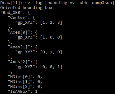 Broken indentation. + template<class T> Bnd_Box ToBndBox (const NCollection_Vec3<T>& theType1, + const NCollection_Vec3<T>& theType2) Why "theType"? I would expect theMin/theMax instead. Description of these methods is missing. +Bnd_Box::Bnd_Box (const Standard_Real theXmin, const Standard_Real theYmin, const Standard_Real theZmin, + const Standard_Real theXmax, const Standard_Real theYmax, const Standard_Real theZmax) I don't think it is a good idea adding methods taking per-component arguments. Better adding gp_Pnt and NCollection_Vec3 constructors. + DUMP_FIELD_VALUES_SUBCLASS (theOStream, &XDirection()); + DUMP_FIELD_VALUES_SUBCLASS (theOStream, &YDirection()); + DUMP_FIELD_VALUES_SUBCLASS (theOStream, &ZDirection()); ... + DUMP_FIELD_VALUES (theOStream, XHSize()); + DUMP_FIELD_VALUES (theOStream, YHSize()); + DUMP_FIELD_VALUES (theOStream, ZHSize()); Please avoid using non-virtual methods instead of class fields. +TCollection_AsciiString getLevelIndent (const int theLevel) Unexpected global function. + TCollection_AsciiString aValue = aSplitValues.FindFromIndex (anIndex); + TCollection_AsciiString aKey = aSplitValues.FindKey (anIndex); const TCollection_AsciiString& ? + /** + * @brief Simple sentry class providing convenient interface to dump. + * + * Appends start and last rows in dump with class name key + * + * Create instance of that class in the first row of Dump. + */ + class Sentry Inconsistent doxygen style.