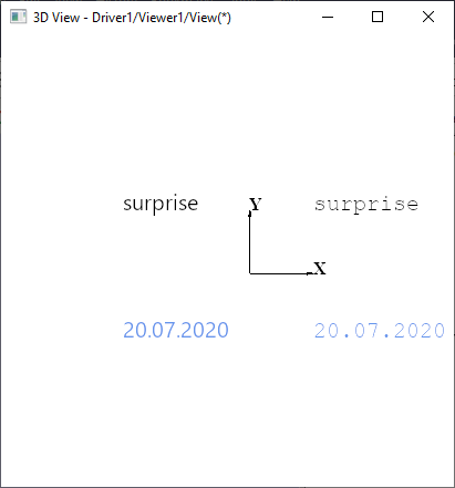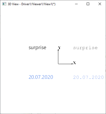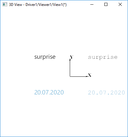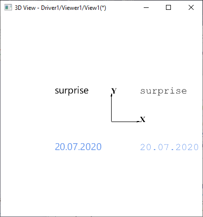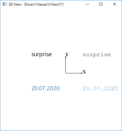 | Steps To Reproduce | pload ALL vinit vsetcolorbg 255 255 255 vlight -clear vlight -add ambient vtrihedron t1 -drawAxes XY -arrowColor 0 0 0 -color Whole 0 0 0 -textColor 0 0 0 vdrawtext text1 surprise -pos 100 100 0 -color 0 0 0 -height 20 vdrawtext text2 20.07.2020 -pos 100 -100 0 -color 0.1725 0.4745 0.70196 -height 20 vdrawtext text3 surprise -pos -200 100 0 -color 0 0 0 -height 20 -font "Segoe UI" vdrawtext text4 20.07.2020 -pos -200 -100 0 -color 0.1725 0.4745 0.70196 -height 20 -font "Segoe UI" vfit vtop vzoom 0.5 | ||||