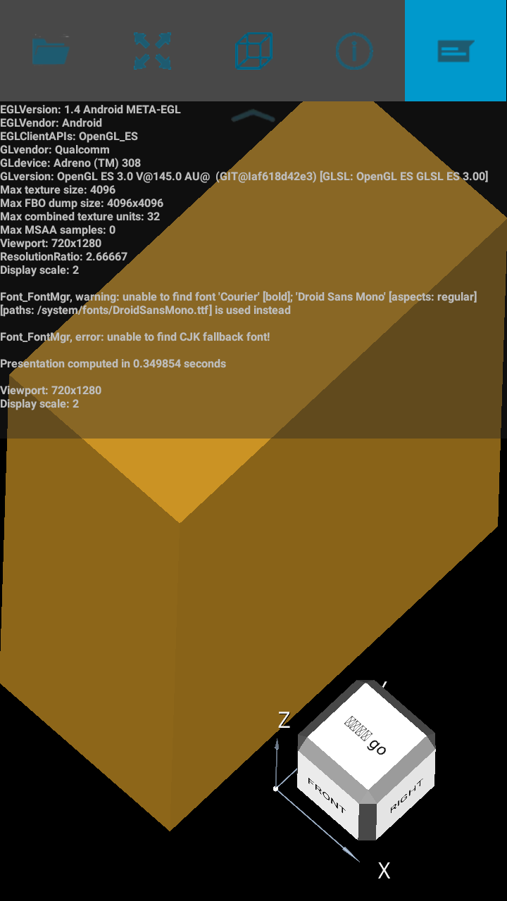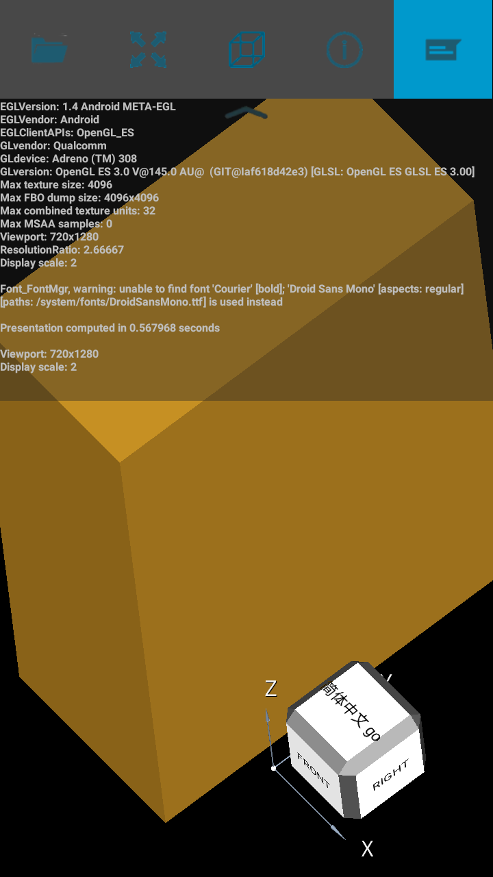 Vico, Font_FontMgr registers fallback fonts in constructor via addFontAlias() method in constructor. This logic is fragile, as it is based on the knowledge of standard font families pre-installed on specific platforms (and OS vendors tend to change fonts from version to version). Newer Android devices are shipped with "Noto Sans CJK JP" font family supporting CJK characters. I have added this font in CR31720 - see attached screenshots of JNI sample: void OcctJni_Viewer::initContent() ... + myViewCube->SetBoxSideLabel (V3d_TypeOfOrientation_Zup_Top, u8"简体中文 go"); } myContext->Display (myViewCube, false); iOS is a different story, as this closed platform does not permit file access to standard fonts, and the only way to draw text there is shipping some fonts with application itself and registering them within Font_FontMgr (of course, this option is available on other platforms as well to ensure all necessary fonts are available, but this raises additional legal issues for finding free/buying fonts and bloats application binary with extra files). |