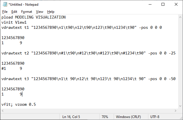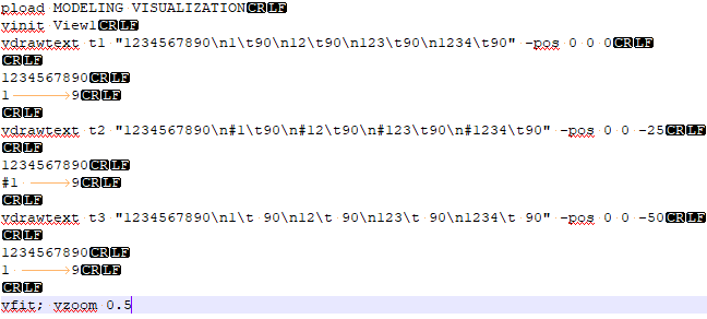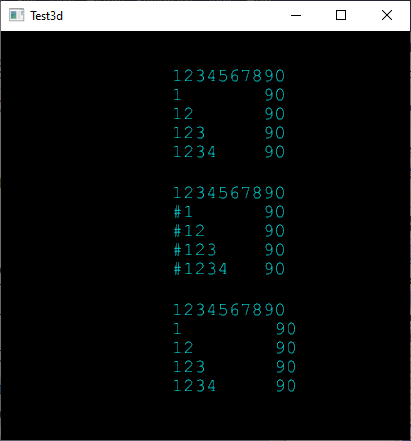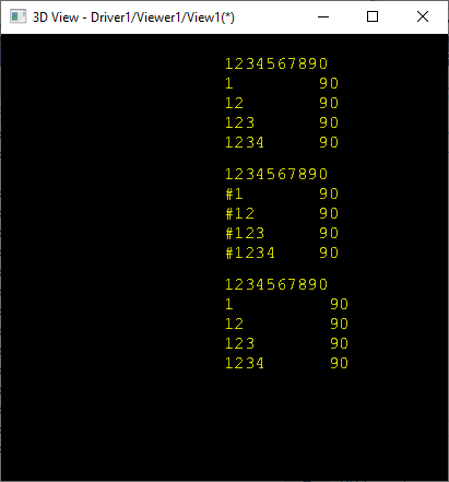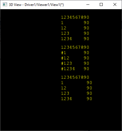 | Steps To Reproduce | pload MODELING VISUALIZATION vinit View1 vdrawtext t1 "1234567890\n1\t90\n12\t90\n123\t90\n1234\t90" -pos 0 0 0 1234567890 1 9 vdrawtext t2 "1234567890\n#1\t90\n#12\t90\n#123\t90\n#1234\t90" -pos 0 0 -25 1234567890 0000001 9 vdrawtext t3 "1234567890\n1\t 90\n12\t 90\n123\t 90\n1234\t 90" -pos 0 0 -50 1234567890 1 9 vfit; vzoom 0.5 for old OCCT: pload MODELING VISUALIZATION vinit View1 vdrawtext t1 "1234567890\n1\t90\n12\t90\n123\t90\n1234\t90" -pos 0 0 0 1234567890 1 9 vdrawtext t2 "1234567890\n#1\t90\n#12\t90\n#123\t90\n#1234\t90" -pos 0 0 -25 1234567890 0000001 9 vdrawtext t3 "1234567890\n1\t 90\n12\t 90\n123\t 90\n1234\t 90" -pos 0 0 -50 1234567890 1 9 vfit; vzoom 0.5 | ||||