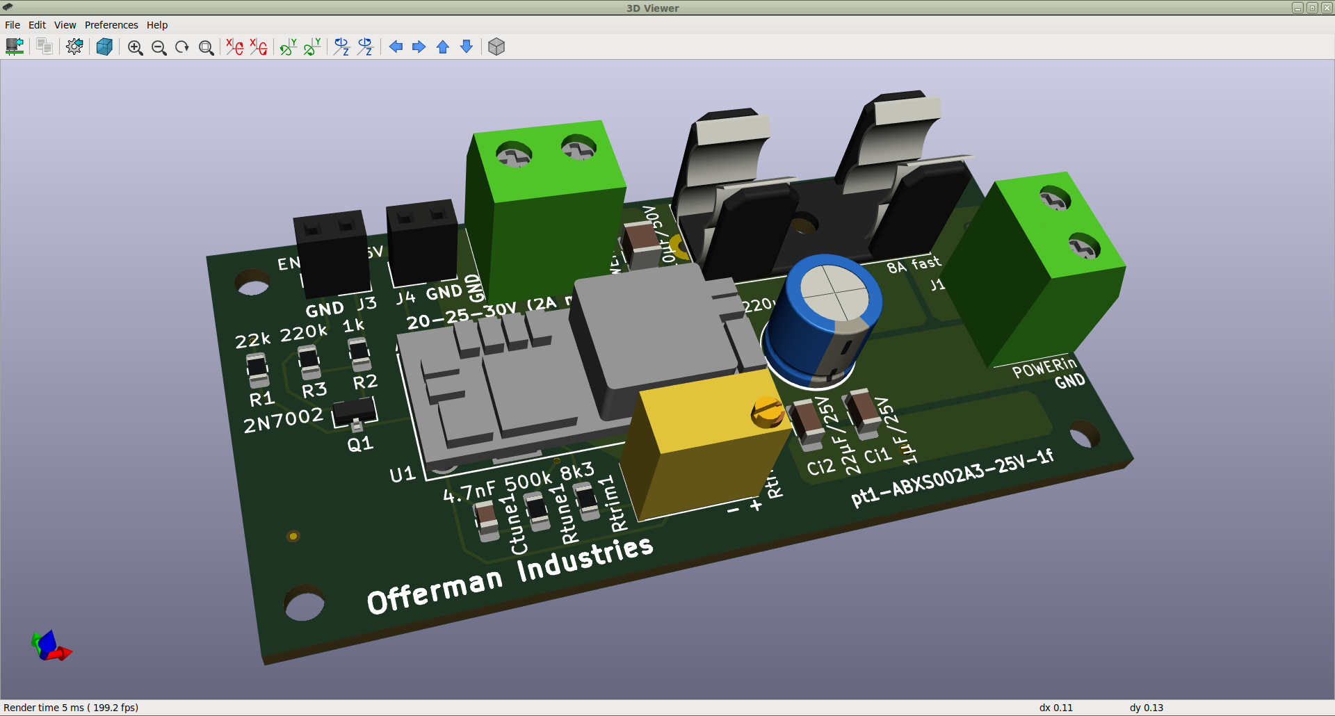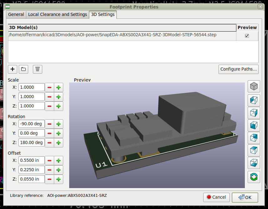 | Steps To Reproduce | pload XDE OCAF VISUALIZATION ReadStep D SnapEDA-ABXS002A3X41-SRZ-3DModel-STEP-56544.step #XShow D; vsetdispmode 1 XDisplay -dispMode 1 D vfit vviewparams -scale 36 -proj 0.5 0.8 0.3 -up -0.4 0.5 -0.8 -at 0.7 3.1 0.3 Always the same issue after opening the layout file in KiCad's 3D viewer. Also checked the 3D preview in the footprint editor (Footprint Properties -> 3D Settings), and there the model is grey-colored too. I've already reset the Viewer settings (Preferences -> Reset to Default Settings), to no avail. | ||||