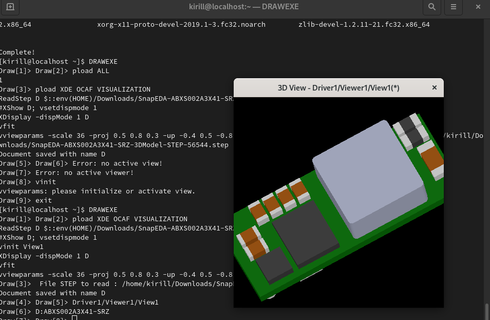 Installed Draw Harness in Fedora 32:sudo dnf install opencascade-draw sudo dnf install opencascade-devel dnf info opencascade-draw As Draw Harness package is broken in Fedora, reconstruct minimal environment for loading plugins and start DRAWEXE: