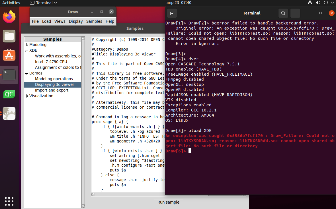 | Steps To Reproduce | sudo apt-get install occt-draw occt-draw > pload ALL KO sudo apt-get install libocct-draw-dev occt-draw > pload ALL OK Problem 1: DRAWEXE should be able loading plugins without development package installed. Problem 2: samples coming with DRAWEXE unable to find necessary resources | ||||