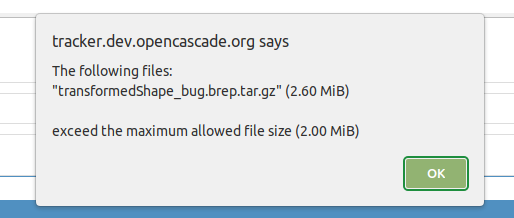 @Heike have you tried using more modern compression algorithms like `tar.xz`? I guess that it may beat the difference to fit into current limits. Otherwise - may you try sharing the file in some other way temporarily? I would expect that problem should be reproducible with smaller data set, so that alternatively you may explode the shape and save a smaller .BREP. |