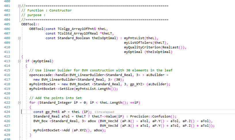 Line 422 of the the file bnd_OBB.cxx is a bug that shout instead be something like : for (Standard_Integer iP = theL.Lower(); iP <= theL.Upper(); ++iP) Bnd_OBB.cxx_Line_400_429.PNG (34,077 bytes) |