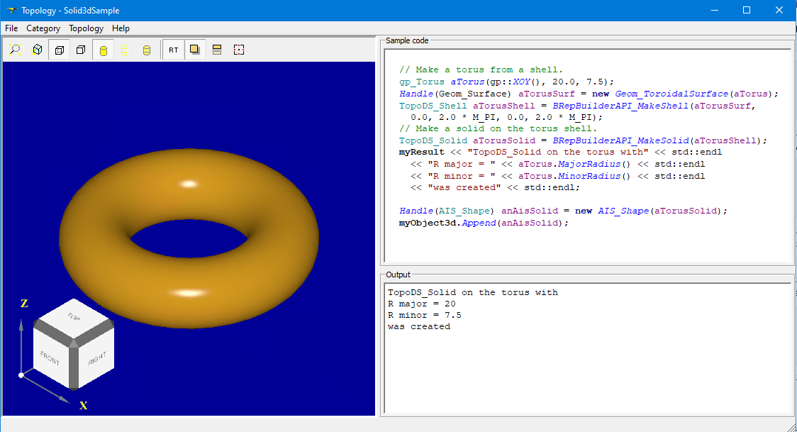 Each sample presents geometry view, C++ code fragment and sample output window. This sample is described in the Novice guide for new users.