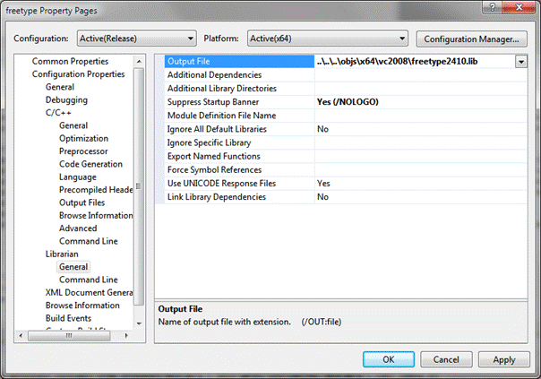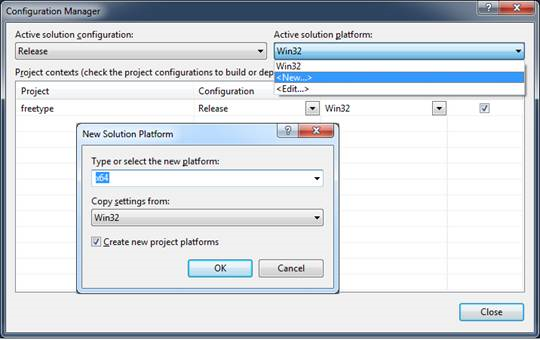 3rdparty folder. As a result, you will get a folder named, for example, 3rdparty/freetype-2.4.10. Further in this document, this folder is referred to as freetype.freetype/builds/win32/vc20xx/freetype.sln in Visual Studio. Here vc20xx stands for your version of Visual Studio.Debug or Release.freetype project.freetype import library (.lib) in the freetype/obj/win32/vc20xx folder.Build - Configuration Manager and add x64 platform to the solution configuration by copying the settings from Win32 platform: